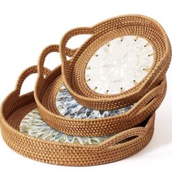 Set of 3 Handwoven Rattan Trays with Natural Shell Inlay, Boho Decorative Wicker Serving & Coffee Table Trays with Handles for Home Decor, Candles, Sn$20El Monte, CA