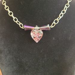 Handblown Glass Purple Swirl Puff Heart on Silvertone Chain Necklace 18.5" F9 $17Diamond Bar, CA