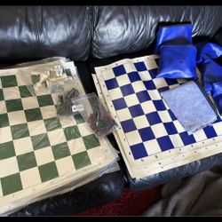 Lot of 17 Vinyl Rollup Chess Board with 4 Stand Club Plastic Chess set Black & Ivory Pieces$80Los Angeles, CA