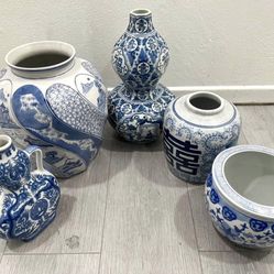 CHINESE BLUE & WHITE PORCELAIN VASES SET OF 5 TEACHER & STUDENT, DOUBLE HAPPINESS, FLORAL MOTIFS$400Montclair, CA