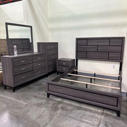 Queen Gray 4pc Bedroom Set Bed Dresser Mirror Nightstand Optional Chest, extra nightstand, King size and mattress set available for extra pick up can $699La Verne, CA