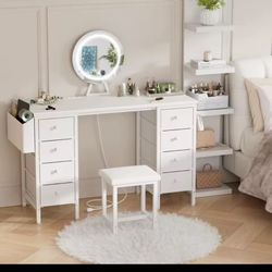White Vanity Desk with Mirror and Light- Makeup Vanity Set Table with Chair, Storage, Lighted Mirror, 8 Large Fabric Drawers $160San Gabriel, CA