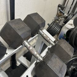 Weights dumbbells set of two 50 pound dumbbells, only weights Sold as pair only Ignore Gym machine squat rack pull a bar Smith machine weigh$130Burbank, CA