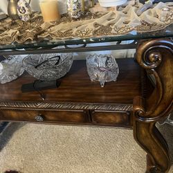 10 piece antique dining table with 2 leaves and glass top, buffet, hutch and sideboard$800Escondido, CA