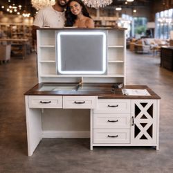 Farmhouse Vanity with Glass Top & Charging Station, Vanity Desk with Touch Screen Mirror and Lights, Makeup Vanity with 5 Drawers & Shelves & Cabinet,$160Santa Ana, CA