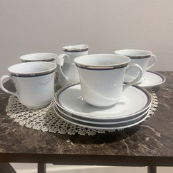 Blue and white with gold rim set of four tea cups with saucers small milk pitcher and sugar bowl$50Los Angeles, CA