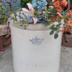 Crock Blue Crown Buckeye Pottery 5 Gallon Stoneware with Wooden Spool and Wire Handles Great Condition $175Whittier, CA