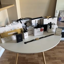 Collection of empty Chanel paper bags, envelopes, tissue, bows and cologne box. $40Irvine, CA