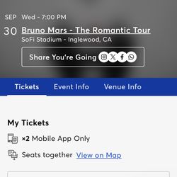 Bruno Mars 2x Tickets LA The Romantic Sofi Stadium Transfer Ready.$245Irvine, CA