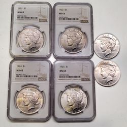 1922, 23, 24, 25, 26, 1927 Peace Silver Dollar Collection MS63 NGC & XF $1 US 90%$550Sacramento, CA