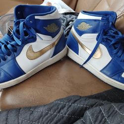 This is a Nike Air Jordan 1 Retro High "Gold Medal" in a white and deep royal blue colorway with a metallic gold Swoosh and Wings logo. $40San Diego, CA