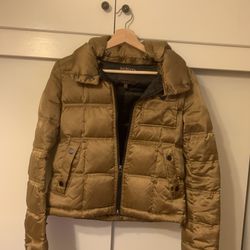 Ochirly zipper quilted down hooded short jacket coat with removable hood gold 2 side entry pockets Removable hood Minor Scratch on the bottom of back $25Pittsburg, CA