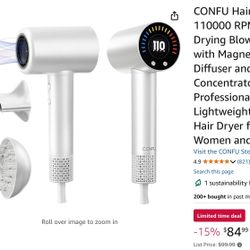 CONFU Hair Dryer, 110000 RPM Fast Drying Blow Dryer with Magnetic Diffuser and Concentrator, Professional Lightweight Ionic Hair Dryer$50Carlsbad, CA
