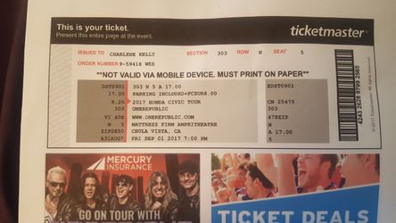 Onerepublic tomorrow night 9/1 2 tickets$40Valley Center, CA