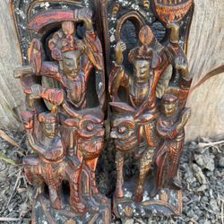 Pair Of Asian Carved Wood - 9x3x1.5 Inches - Mystical Bird/ram/horse Like Creature, People & Swords With Some Color Left $75Carlsbad, CA