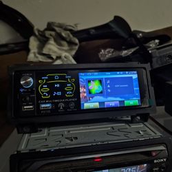 a 7-inch car MP5 player, model 7023B, along with its accessories, including a remote control and wiring harnesses. $55Hemet, CA