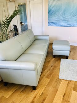 Living Spaces Leather Sofa and Foot Stool Light Blue Italian leather $1200$600Oceanside, CA