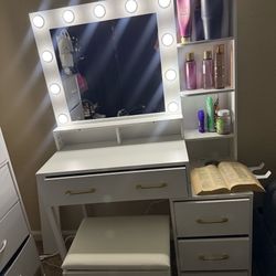 Modern and practical vanity table with mirror, chest of drawers, shelves, open storage, white color,$80Temecula, CA