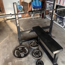 Olympic Weight Bench Bench Press, Barbell, Curl Bar, Weights. $350Murrieta, CA