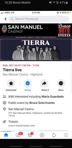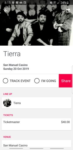 Tierra at San Manuel oct. 20th 2 tickets$80Colton, CA