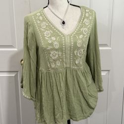 Good Condition | S Max Studio Indian Green embroidered babydoll blouse with bell sleeves and V-neckline. $35Corona, CA