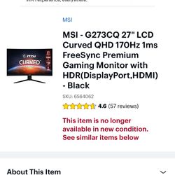 MSI - G273CQ 27" LCD Curved QHD 170Hz 1ms FreeSync Premium Gaming Monitor with HDR(DisplayPort,HDMI) - Black$150Covina, CA