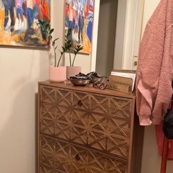 Tribesigns wooden shoe cabinet features two flip-down drawers with a geometric patterned design and an open storage shelf. $50Irvine, CA