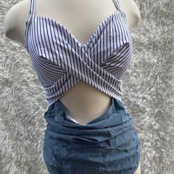 Striped Twist-Front Blue & White Swimsuit Top with Blue Bottom size medium$14Bell Gardens, CA