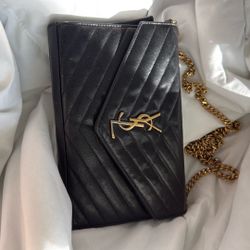 YSL Saint Laurent Cassandre matelassé leather wallet on a chain in black with gold-tone hardware. $500San Francisco, CA