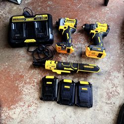 Brand new DEWALT tools compact 1/2” Hammer drill with battery, brushless compact 1/4” impact driver with battery, atomic cordless 1/2” ratchet with b$500San Bruno, CA
