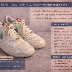 Nike Air Force 1 Low – White w/ Green Accents (Men’s 9.5)$50Fresno, CA
