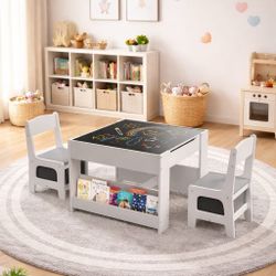 Table and Chairs Set, 4 in 1 Toddler Art Desk with Storage Drawer, Wooden Activity Deskboard, Blackboard, Reversible & Detachable Tabletop, Bookshelf $45Fontana, CA