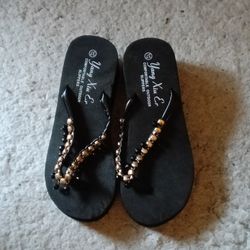 Comfortable Outdoor Slippers With A Black Sole And Gold Toned Beaded Straps (Size: 6.5-7)$10Hazard, CA