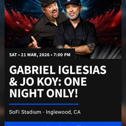 Gabriel Iglesias & Joe Koy: One Night Only! Sofi Stadium - Inglewood, CA$1,000West Covina, CA