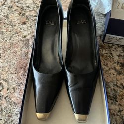 Stuart Weitzman Tipimage women 9 M Black Leather pump with pointed Gold Toe Tip and Gold heels $40Laguna Niguel, CA