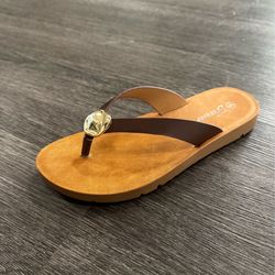 New brown flat-thong style flip flop with gold medallion$20City Of Industry, CA