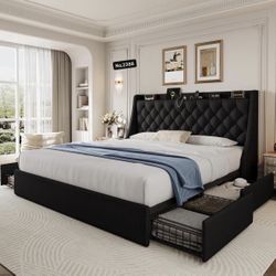 King Size Upholstered Platform Bed Frame with 4 Storage Drawers and Charging Station, Linen Button Tufted Wingback Headboard, Sturdy Wooden Support Sl$225El Monte, CA