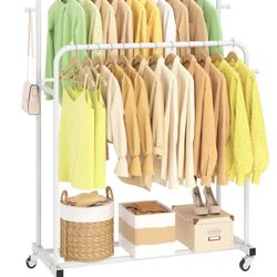 Double Rods Garment Rack with Wheels, Clothing Rack for Hanging Clothes,4 Hooks, Multi-functional Bedroom Clothes Rack, White$30Hawthorne, CA