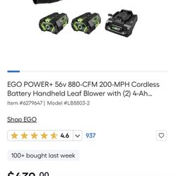 EGO POWER+ 56v 880-CFM 200-MPH Cordless Battery Handheld Leaf Blower with (2) 4-Ah...$310Tujunga, CA