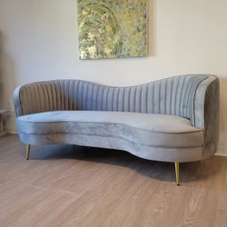 Sofa Grey Velvet, Metal Legs Gold Finish, Channeled Tufting, Bench Style Seat Cushion. Inverted Camel Back. 84"x36"x33"h. New Especial Price $680Santa Ana, CA