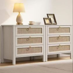 New assembled White Nightstand Set 2 with Drawers - Large Rattan Bedside Table with Golden Handle, 3 Drawers Night Stand Tall End Table 26.78" Wide Si$150Norwalk, CA