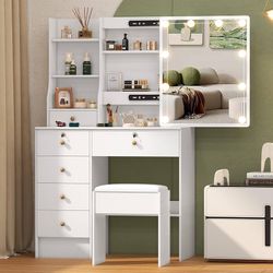 Umeiga Small Desk with Mirror and Lights, 32-Inch Makeup Table with Sliding Mirror, Drawers and Chair, Hollywood Vanity with 3 Modes of Adhesive LED B$110Orange, CA