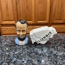 Ceramic Illinois State Shape and president Lincoln Pair of Salt And Pepper Shakers. Preowned. No stoppers. Has been on display in a cabinet with a $30Artesia, CA