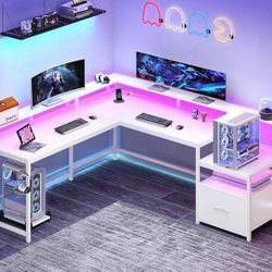 White L Shaped Gaming Desk, 66" Home Office Desk with Wood File Drawer, Power Outlet and Led Lights, Corner Computer Desk with Monitor Shelf$110Montclair, CA