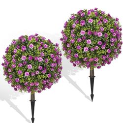Artificial Purple Rose Topiary Ball Trees with Ground Spike Set of 2, Faux Boxwoods for Outdoor Planters, UV Resistant Artificial Outdoor Plants for P$39Los Angeles, CA