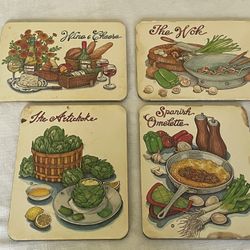 Set of four 1970s vintage decorative kitchen trivets with food illustrations. 6.5”x 8.5” Each$25Anaheim, CA