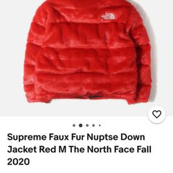 Supreme Faux Fur Nuptse Down Jacket Red M The North Face Fall 2020$1,100Los Angeles, CA