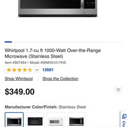 Whirlpool 1.7 Cu Ft 1000 Watt Over The Range Microwave-Stainless Steel$150San Jose, CA