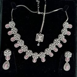 Indian Silver Finish Pink & Clear CZ Necklace Set with Maang Tikka & Earrings For Weddings And Functions$38Fremont, CA