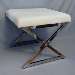 Square faux leather white vinyl padded ottoman foot stool with X frame criss cross chrome base$160San Mateo, CA